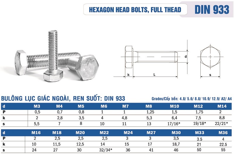 Tùy theo nhu cầu sử dụng mà chúng ta có khá nhiều sự lựa chọn về chiều dài bulong và các thông số cụ thể. Thông thường bulong có một số kích thước cơ bản như sau: chiều dài của bulong, đường kính thân của bulong, chiều cao giác của bulong. Dưới đây là bản vẽ và thông số kỹ thuật được sản xuất theo tiêu chuẩn Din 933: