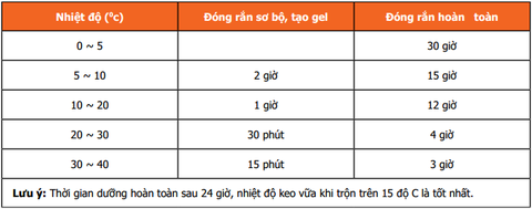 - Bước 5: Chờ thời gian đông kết keo theo bảng dưới đây là có thể lắp được tải:
